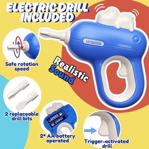 ⚙️ Realistic Electric Drill: Includes a working toy drill with sound effects, interchangeable bits, and a safe rotation speed that’s just right for kids. Perfect for pretend play that feels just like the real thing!
